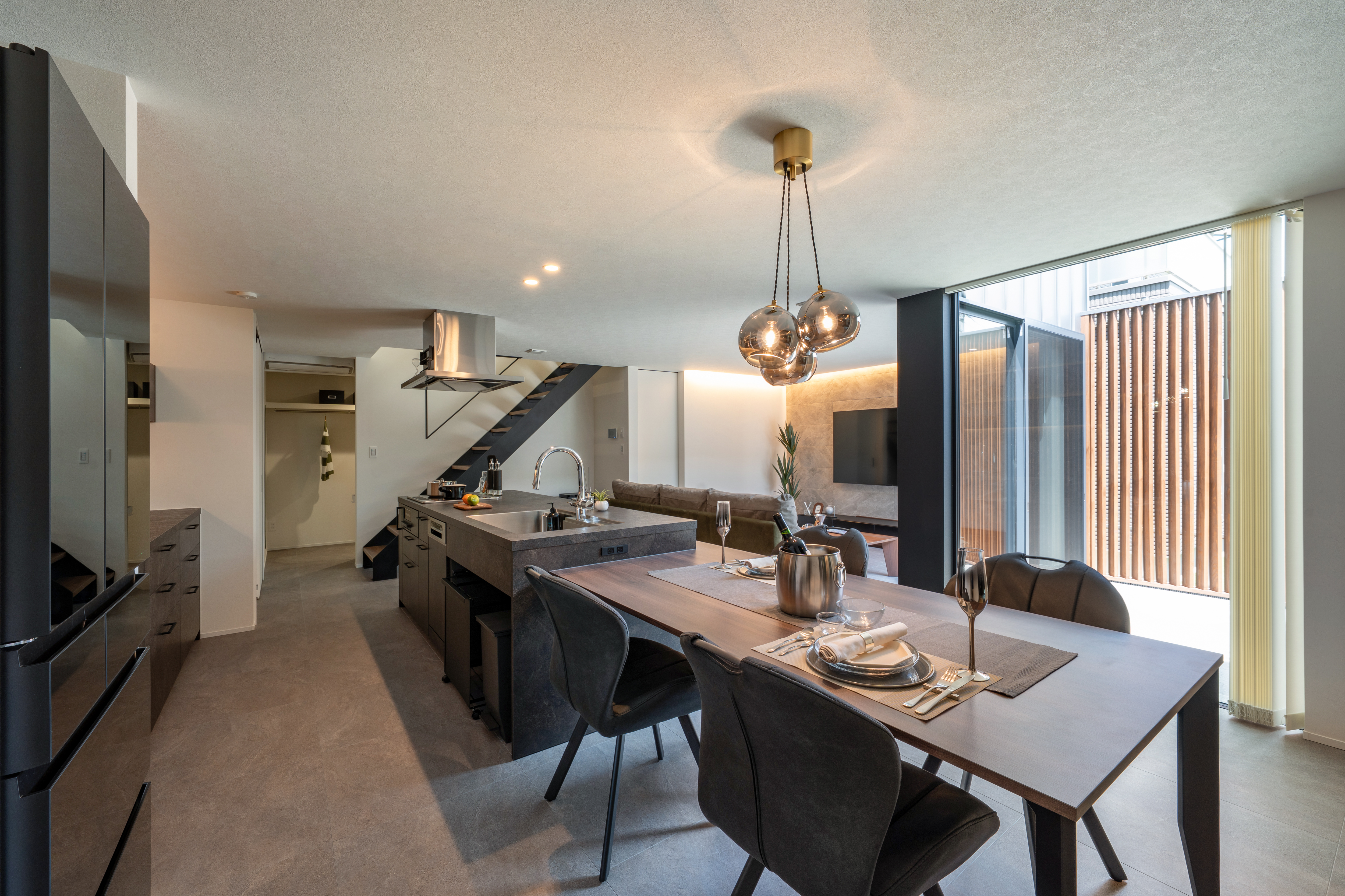 グレーやブラックを基調に、間接照明や素材の陰影で上品さを演出します。