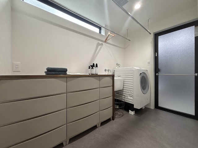 一建では、カラーボックスのサイズに合わせた造作カウンターを設け、洗濯物を畳んだり収納したりしやすいランドリー空間をご提案しています。