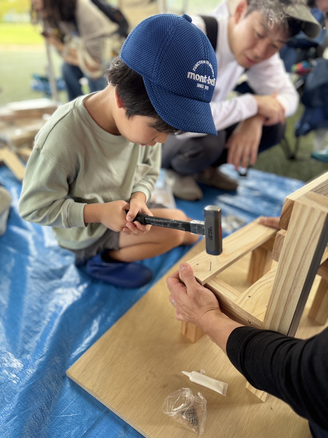 会場全体では手作り品やフードブース、ほかの木工体験ブースや、大工と一緒に上棟体験など