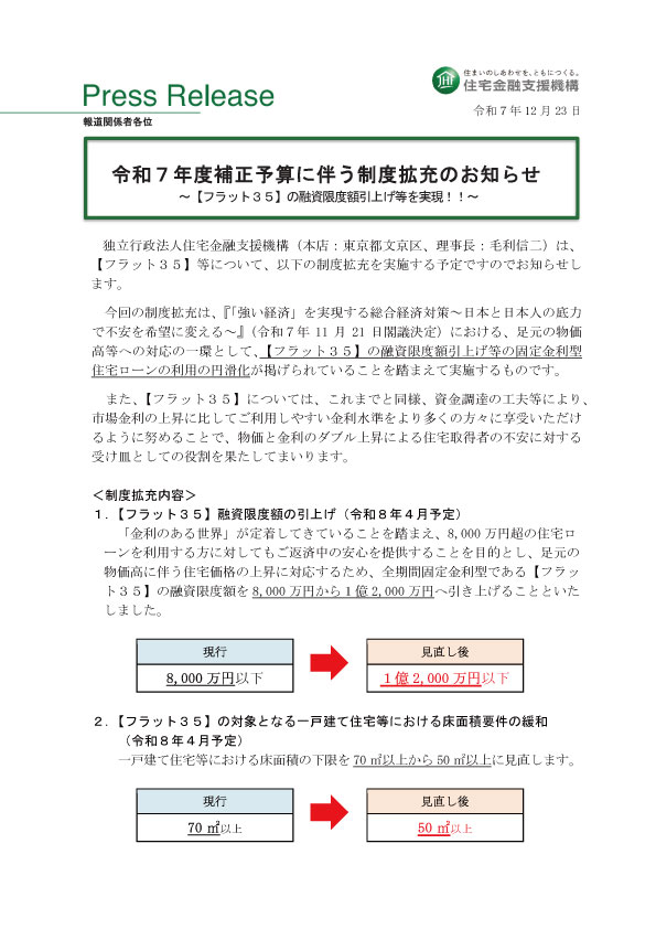足元の物価高に伴う住宅価格の上昇及び金利の上昇傾向に対応するため、比較的高額の住宅ローン利用者に対し返済中の安心を提供することを目的として、全期間固定金利型であるフラット35の融資限度額を8,000万円から1億2,000万円へ引き上げることとしました。