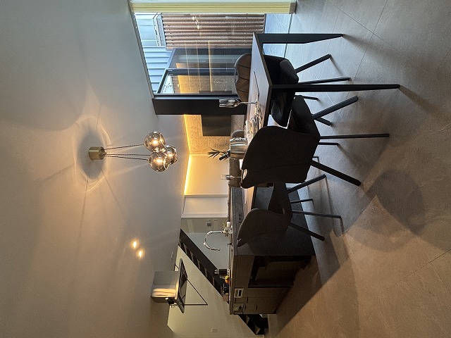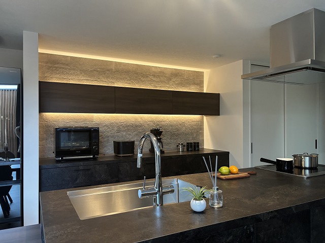 床材にはフロアタイルを採用し、間接照明と組み合わせることで深みのある佇まいを演出しています。