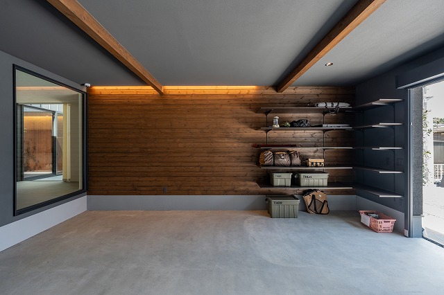 アウトドア用品や工具を整理できる収納も設け、機能も兼ね備えます。