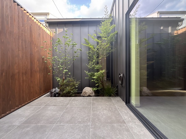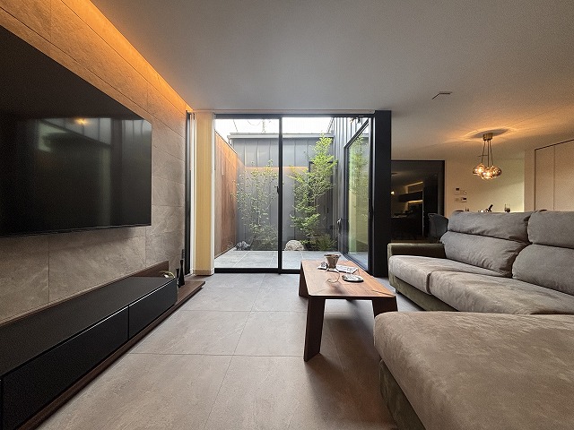 フロアタイルと中庭のタイルデッキの質感を揃えることで、内と外がゆるやかにつながる心地よい空間に。